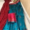 Drape yourself in timeless elegance with this exquisite Litchi Silk Lehenga Set. The teal-blue pleated skirt is woven with delicate zari motifs and finished with an intricate contrast border in deep maroon, adding a royal touch. Paired with a matching maroon Banarasi blouse piece and a rich maroon bandhani-style dupatta, this ensemble beautifully blends traditional charm with festive vibrance. Perfect for weddings, festivals, and celebratory occasions, this set captures the grace of Indian craftsmanship in every fold.