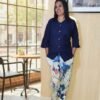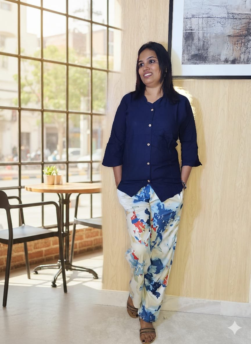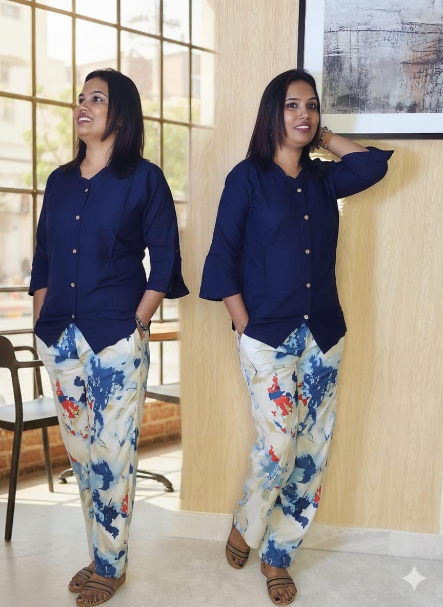 Step into effortless chic with this beautiful top and palazzo set. Crafted from premium, breathable Rayon fabric, this ensemble drapes perfectly, offering all-day comfort without compromising on style. The classic shirt-style top features a polished collar and button-down front, balanced by stylish 3/4 sleeves. Paired with the comfortable palazzo pants, which offer a relaxed, flowing fit, this set is perfect for a coffee date, a day of errands, or simply relaxing at home in style.